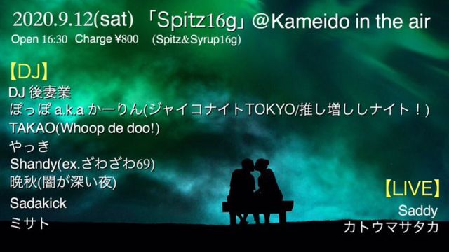 9/12(土)16:30〜 #Spitz16g 場所:亀戸IN THE AIR (〒136-0071 東京都江東区亀戸2丁目25−3 2F) チャージ:800円 3月から延期になっていたスピッツ&Syrup16gオンリーイベントをやります! DJだけではなく弾き語りLIVEパートもあります♪ ※換気タイムもあり 三密を防ぐため定員20名までとなりますので、ご興味ある方はご予約推奨です! syrup16gとスピッツの楽曲に浸りましょう♪ (管理人様貴重なスペースありがとうございました)