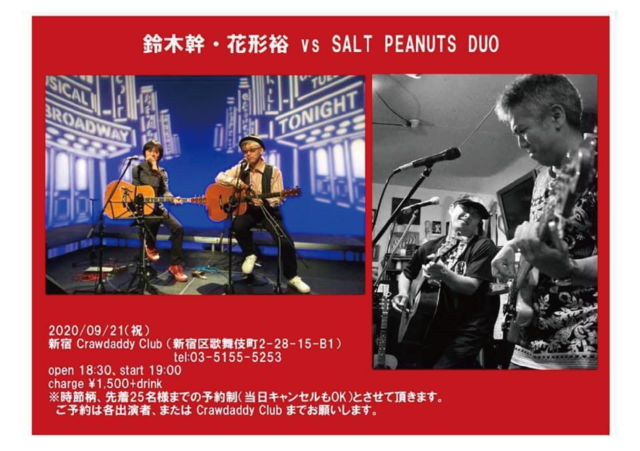 9/21 ËÜÆü¤Î¥é¥¤¥Ö¡¡ SALT PEANUTS DUO¡Ê¿ù¸¶¡Ü¹ÓÀî¡Ë & ÎëÌÚ´´¡¦²Ö·Á͵¡¡LIVE¡¡ OPEN 18:30 START 19:00 CHARGE 1500±ß¡¡ Crawdaddy Club¤Î´¶À÷¾ÉÂкö¤Ï¤³¤Á¤é¤Ç¤¹¡£ https://www.crawdaddy-jp.com/blank-1