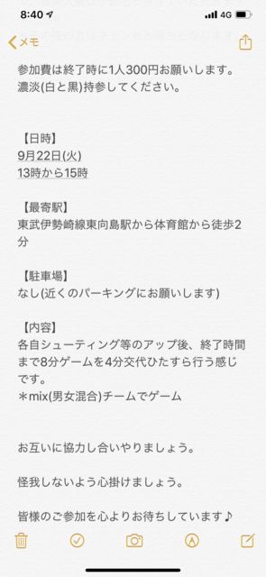 ¤æ¤ë¥Ð¥¹¥±¤Î»²²Ã¼Ô¤òÊ罸¤µ¤»¤Æ¤¤¤¿¤À¤¤Þ¤¹m(_ _)m 9·î22Æü(²Ð)¤Î13¡Á17»þ ÅìµþÅÔ¤ªÂæ¾ìÊÕ¤ê ¸½ºß¡¢14¿Í¤¯¤é¤¤¤Ç¤¹¡ª ½é¿´¼Ô¤ä½÷À¤â¤¤¤é¤Ã¤·¤ã¤¤¤Þ¤¹¡£ »²²ÃÈñ¤Ï600±ß¤Ç¤¹¡ª ¥Á¡¼¥àʬ¤±¤·¤ä¤¹¤¤¤è¤¦¤Ë¡¢Çò¹õ¤ÎÉþ¤¬¤¢¤ë¤È½õ¤«¤ê¤Þ¤¹¡ª ¤Þ¤¿¡¢Ç®¤¬¹â¤¤Êý¤äÂÎÄ´¤¬Ë§¤·¤¯¤Ê¤¤Êý¤Ï¤´±óθ²¼¤µ¤¤m(_ _)m ¤³¤Þ¤á¤Ë¤Ê¼êÀö¤¤¤¦¤¬¤¤¤â¤ª´ê¤¤¤¤¤¿¤·¤Þ¤¹¡¦ »²²Ã¤·¤¿¤¤Êý¤Ï¤ªµ¤·Ú¤Ë¥á¥Ã¥»¡¼¥¸²¼¤µ¤¤¡ª