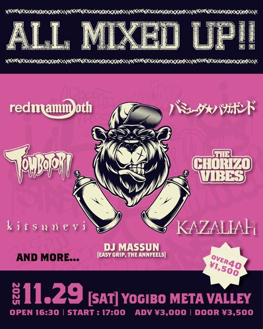 2025年11月29日(土) 大阪 難波 YOGIBO META VALLEY Namba Culture Terminal 2025 【 ALL MIXED UP!! 】 OPEN 16:30 / START 17:00 ADV \3,000 / DOOR \3,500 OVER40(40歳以上の方) \1,500 TOMBOTORI バミューダ★バガボンド redmammoth THE CHORIZO VIBES KAZALIAH kitsunevi DJ MASSUN