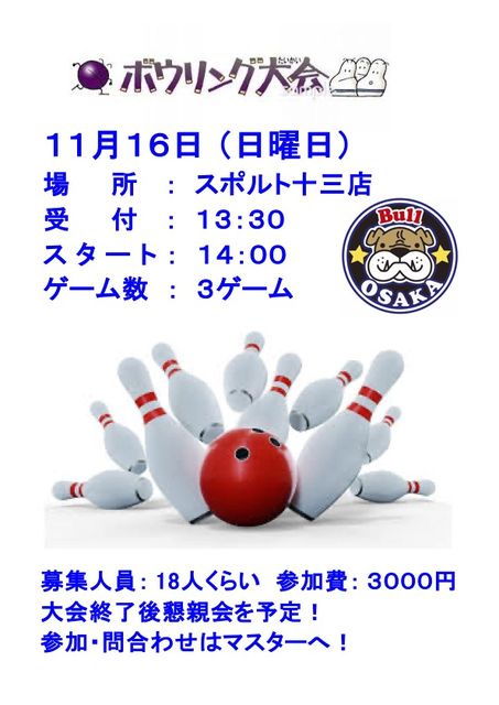 11月予定 ようやく寒くなり秋飛ばしての初冬ですね。 ☆ 褌Day 11月8日(土)17時から21時まで褌オンリーです。 ※ 21時からは通常営業です。 ☆ Bull ボウリング大会 11月16日(日) 13時30分受付 14時スタート 3ゲーム 終了後懇親会予定 参加者募集中 ☆ お休み 定休日木曜:6日・20日・27日 お店休み :12日(水)13日(木) ☆ 14周年感謝祭 12月6日(土)19時〜 軽食あり、飲み放題、歌い放題 ☆ Bull Tシャツ販売中 お店で聞いてね! 霜月に入り急