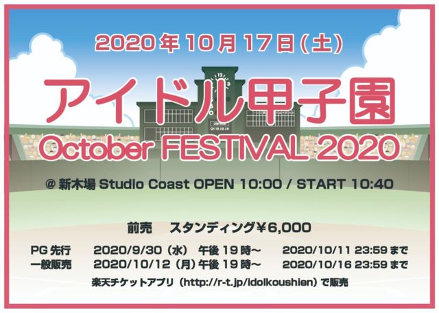 「アイドル甲子園 October FESTIVAL 2020」 日時:10/17(土) 開場10:00 / 開演10:40 会場:新木場スタジオコースト 料金:前売4,000円 チケット:https://ticket.rakuten.co.jp/features/idolkoushien/index.html/ ※09/30 19時販売開始