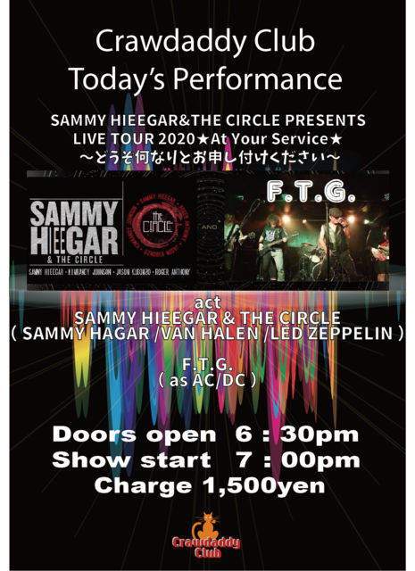 10/17 本日のライブ SAMMY HIEEGAR & THE CIRCLE PRESENTS LIVE TOUR 2020 ★At Your Service★ 〜どうぞ何なりとお申し付けください〜 act F.T.G.( as AC/DC ) SAMMY HIEEGAR & THE CIRCLE( SAMMY HAGAR /VAN HALEN /LED ZEPPELIN ) OPEN 18:30 START 19:00 CHARGE 1500円