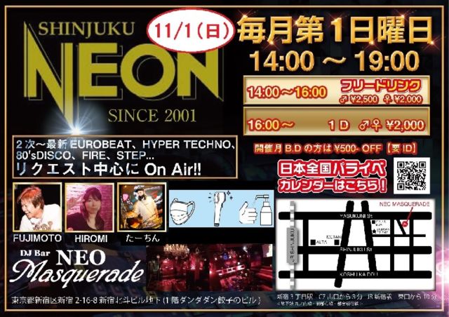 ■新宿NEON 【日時】11/1(日)14:00〜19:00 【ハコ】新宿ネオマスカレード 【料金】14:00〜16:00 フリードリンク ♂2,500 ♀2,000 16:00〜 1D ♂♀とも 2,000 ※11月誕生日の方は写真付ID持参で上記料金より 500-OFF 【選曲】新旧ユーロビート,ハイパーテクノ、80'sDISCO 【DJ】FUJIMOTO、ひろっち、たーちん 換気や消毒、入場制限をはじめ人と人との距離を確保するなど感染拡大防止策を最大限講じて開催いたします。 【お客様へお願い】 ●マスク着用 ●検温(37.5度以