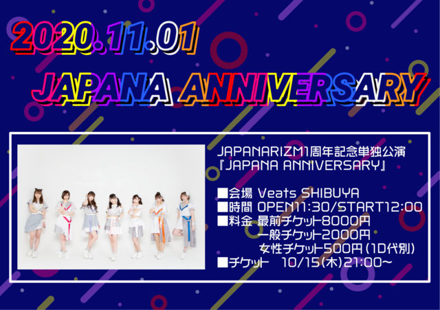 JAPANARIZM1周年記念単独公演「JAPANA ANNIVERSARY」 日時:11/01(日) 開場11:30 / 開演12:00 会場:渋谷Veats 料金:最前8,000円 / 一般2,000円 / 女性500円 (D別) チケット:15(木)21時発売開始 https://t.livepocket.jp/e/japa1101 ※オールスタンディング、女性エリア有り ※フェイスシールド必須、声出し・コール可 ・入場は整理番号順(最前チケット→一般チケット→女性チケット)となります。開場時間より順次ご案内いたします。 ・最前チケットは最前列の指定席となります。整理番号順にご希望のお席へ案内いたします。 ・