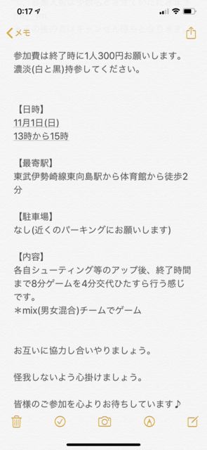 参加費 300円 持ち物 マスク、ゲーム用濃淡Tシャツ等、バスパン、シューズ、飲み物、ボール(あれば)、着替え・・・ 追加参加条件及び変更等 氏名・住所・連絡先の参加者名簿保管します。