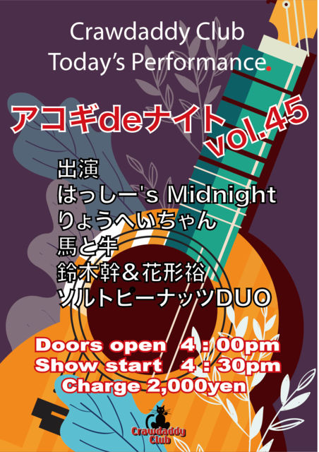 11/3 ËÜÆü¤Î¥é¥¤¥Ö¡¡ ¥¢¥³¥゙de¥Ê¥¤¥È vol.45¡¡ OPEN 16:00 START 16:30 CHARGE 2000±ß¡¡ ½Ð±é ¡¡ ¤Ï¤Ã¤·¡¼'s Midnight ¤ê¤ç¤¦¤Ø¤¤¤Á¤ã¤ó ÇϤȵí ÎëÌÚ´´&²Ö·Á͵ ¥½¥ë¥È¥Ô¡¼¥Ê¥Ã¥ÄDUO