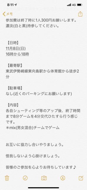 豊島区で活動している社会人チームHush!です。 チームメンバーが足りないので、参加者を8~10人ほど募集します。 ゆるめにエンジョイバスケしています。 年齢問いません。 もぜひご参加ください。 【詳細】 日時 :11/8(日)18時00分〜21時00分 場所:池袋駅徒歩10分 体育館 : 西池袋中学校 参加費:200円/回 【時間】 18:00アップ 18:30練習開始(基本練習を経てゲーム) 21:00 終了目安 1.チーム分けのため、白シャツと濃い色のシャツお持ちください。 2.マスク着用、検温の協力お願いします。 3.コロナ対応として、名前の記入