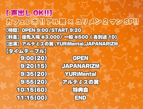 「[声出しOK!!]カフェレボ!!アル翼×ユリメン2マンSP!!」 日時:11/14(土) 開場09:00 / 開演09:20 会場:吉祥寺CLUB SEATA 料金:優先入場3,000円 / 一般500円 (D別) https://tiget.net/events/110928 出演:アルテミスの翼 / YURiMental / JAPANARIZM 【タイムテーブル】 出演中:09:20〜09:40 物販:10:20〜11:15 ※声出し可能公演の為、マスク&フェイスシールド着用でのご入場となります。 ※フェイスシールドをお持ちでないお客様には入り口にて1つ500円にて販売します。