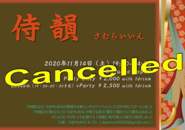 DJ S@MURAIです 新型コロナウイルス感染症の現状に鑑み、再開には未だ厳しい状況と判断し、 11/14開催の『侍韻』を中止することと致します。 皆様にはご迷惑をおかけしますが、ご理解の程よろしくお願い致します。