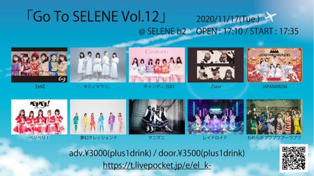 「Go To SELENE Vol.12」 日時:11/17(火) 開場17:10 / 開演17:35 会場:白金高輪SELENE b2 料金:前売3,000円 / 当日3,500円 (1D別) 出演:【eN】/ キミノマワリ。 / キャンディzoo / Zsasz / JAPANARIZM / ベリベリ!/ 夢幻クレッシェンド / レイドロイド / マニマニ / われらがプワプワプーワプワ チケット:https://t.livepocket.jp/e/el_k- ※10/29(木) 20時販売開始