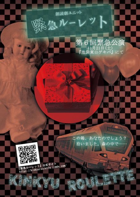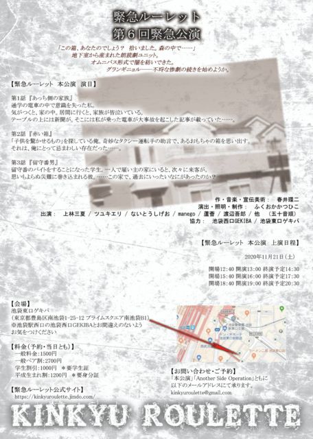 朗読劇 緊急ルーレット「第6回 緊急公演」に出演します。 今回はこわ〜いお話3本だて 学生から犯罪者までいろいろやります 日程 2020年11月21日(土) 開場12:40 開演13:00 終演予定14:30 開場15:40 開演16:00 終演予定17:30 開場18:40 開演19:00 終演予定20:30 出演 上林三夏、ツユキエリ、manego、ないとうしげお、渡辺吾郎、蘆薈 会場 池袋東口ゲキパ 料金 一般1500円 ペア割2700円 学生割引1000円 *要学生証 平成生まれ割引1200円 *要身分証 ご予約お待ちしております。m(_ _)m