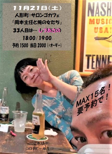 ●概要 11月21日(土) 人形町:サロンゴカフェ http://www.cafe-salongo.com/ 岡本主任と俺の女たち 〜33人目は…しづあさの 18:00/19:00 予約1500 当日2000 (+オーダー) ●定員 コロナ対策の一環として、キャパ半分程度の15名をMAXとします。 ご来場予定者は必ず事前に、出演者までご連絡をお願い致します。 ●タイムスケジュール 19:05 岡本主任 19:40 しづあさの 20:10 休憩 20:20 しづあさの 20:55 岡本主任 21:25 アンコールセッション ●アクセス 最寄駅は人形町駅。 日比谷線だと、「A2」出口出て