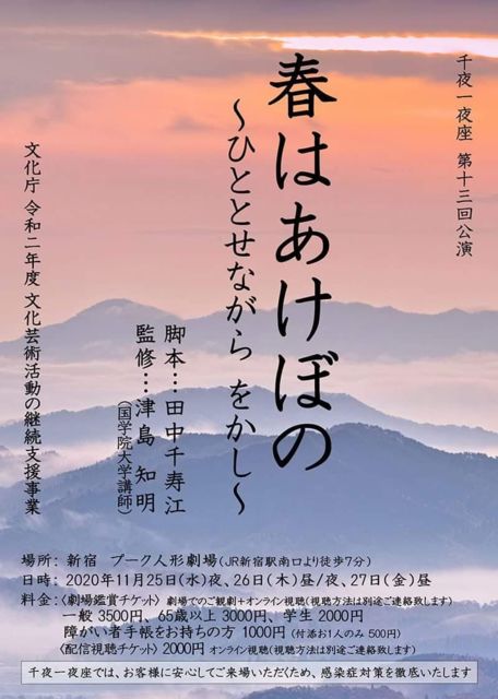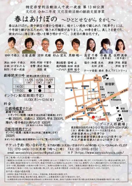 千夜一夜座 第十三回公演 はるはあけぼの 〜ひととせながら をかし〜 脚本・・・田中千寿江 監修・・・津島 知明(国学院大学講師) 令和二年度文化芸術活動の継続支援事業 期間:2020年11月25日〜27日 日時:11月25日(水) 19:00〜 11月26日(木) 14:00〜 19:00〜 11月27日(金) 14:00〜 配信:11月30日(月)〜12月6日(日)オンライン配信予定 会場:プーク人形劇場(JR新宿駅南口より徒歩7分) 〒151-0053 渋谷区代々木2-12-3 アクセスhttps://p