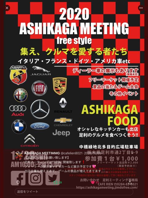 2020足利ミーティングが開催されます 9時〜15時までです。 車好きは集まれ! 的な企画で参加費1000円掛かりますが、行こうと思います ディーラー車の展示や、フリーマーケット、その他いろいろ楽しそうな企画があるみたいです。 一緒に遊びに行きたい人は参加表明をお願いします ちなみに会場は八雲神社の近くになります