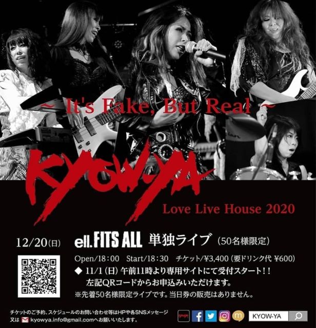 KYOW-YA単独ライブ Love Live House 2020 〜 It's Fake, But Real 〜 2020年12月20日(日) ell.FITS ALL 名古屋市中区大須2-10-43 地下鉄鶴舞線『大須観音駅』2番出口より徒歩1分 TEL 052-211-3123 https://www.ell.co.jp/ Open 18:00 /Start 18:30 チケット ¥3400(要ドリンク代 ¥600) ※当日受付にてお支払いください。 ★11/1(日)午前11時より下記専用予約サイトにて受付開始 https://docs.google.com/forms/d/1vLiTltu0k7sfgeCDcLqzZGoqh_Du02Kry37tFLgBwNU/edit ※先着50名様限定 ※当日券の販売はありません。