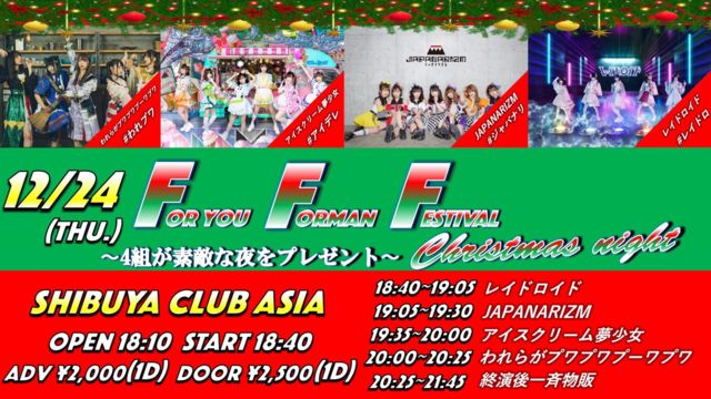 ¡ÖFor you Forman Festival¡× Æü»þ¡§12/24() ³«¾ì18:10 / ³«±é18:40 ²ñ¾ì¡§½Âëclub asia ÎÁ¶â¡§Á°Çä2,000±ß / ÅöÆü2,500±ß (DÊÌ)¡¡https://tiget.net/events/115254 ½Ð±é¡§¥¢¥¤¥¹¥¯¥ê¡¼¥àÌ´¾¯½÷/¥ì¥¤¥É¥í¥¤¥É/JAPANARIZM/¤ï¤ì¤é¤¬¥×¥ï¥×¥ï¥×¡¼¥ï¥×¥ï ¡Ú¥¿¥¤¥à¥Æ¡¼¥Ö¥ë¡Û ½Ð±é¡§19:05¡Á19:30 ʪÈΡ§½ª±é¸å 20:25¡Á21:45