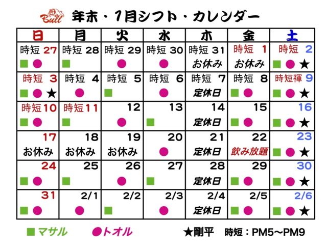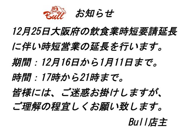 ¤³¤ó¤Ë¤Á¤Ï¡¢¤â¤¦´ö¤Ä¿²¤ë¤È¤ªÀµ·î¡Á¸å3Æü¤Ç¤¹¤Í¡ª 12·î25ÆüÂçºå»Ô¤Î»þûÍ×ÀÁ¤Ë¤è¤ê 1£²·î£±£¶Æü(²Ð)¡ÁÎáÏÂ3ǯ1·î11Æü(·î)¤Þ¤Ç¤Î£±£·»þ¤«¤é£²£±»þ¤Þ¤Ç»þû±Ä¶È¤·¤Þ¤¹¡£ Bull¤Ï²¼µ¥³¥í¥ÊÂкö¤ò³¤±¤Æ¤ª¤ê¤Þ¤¹¡£ ¡ä¡¡ÆþŹ»þ¤Î¸¡²¹¡¢¥¢¥ë¥³¡¼¥ë¾ÃÆÇ ¡ä¡¡¥Þ¥¹¥¯¥·¡¼¥ë¥ÉÃåÍÑ ¡ä¡¡¥«¥¦¥ó¥¿¡¼Àʤδְú¤ ¡ä¡¡¥Ü¥Ã¥¯¥¹ÀʤǤϤªµÒÍÍÆ±»Î¤Î¥½¡¼¥·¥ã¥ë¥Ç¥£¥¹¥¿¥ó¥¹ ¤ªµÒÍͤˤÏÂçÊѤ´ÉÔÊØ¤ò¤ª³Ý¤±¤·¤Þ¤¹¤¬¤´Íý²ò失¤Þ¤¹¤è¤¦¸æ´ê¤¤Ãפ·¤Þ¤¹¡£ ǯËö¤È1·î¤Î±Ä¶ÈͽÄê¤Ç¤¹¡£ ǯËö¤Ï¡¢12·î29Æü(²Ð)¡¦30Æü(¿å)¤Î17»þ¤«¤é21»þ¤Þ¤Ç¤Î±Ä¶È¤Ç¤¹¡£ ¤ªµÙ