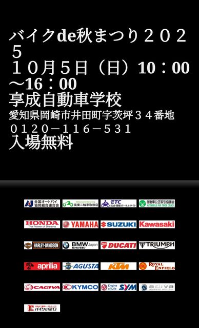 2025ǯ 10·î5Æü¡ÊÆü¡Ë Âè1²ó¡¡¥Ð¥¤¥¯º×²ñ¾ì¤Ç¥ß¡¼¥Æ¥£¥ó¥° ½¸¹ç¡¦10»þ¡Á ²ò»¶¡¦12»þ ¡ù¥Ð¥¤¥¯de½©º×¤ê»î¾è²ñ¡×¤È¤Ï¡¢°¦ÃÎ¥ª¡¼¥È¥Ð¥¤»ö¶È¶¨Æ±Áȹç¡ÊAJ°¦ÃÎ¡Ë ¼çºÅ¤Ç°¦Ãθ©Æâ¤òÃæ¿´¤Ë³«ºÅ¤µ¤ì¤ë¡¢ ¥Ð¥¤¥¯¤ÎÂθ³»î¾è²ñ¥¤¥Ù¥ó¥È¤Ç¤¹¡£ 2025ǯ¤Î³«ºÅ¤Ï¡¢ 10·î5Æü¡ÊÆü¡Ë¤ËµýÀ®¼«Æ°¼Ö³Ø¹» ²¬ºê¹»¡Ê°¦Ãθ©²¬ºê»Ô¡Ë¤Ç ¹Ô¤ï¤ì¡¢¹ñ»º¥á¡¼¥«¡¼¡¦Í̾͢Æþ¼Ö¤Ê¤É¿¿ô¤Î¼Öξ¤Ë¾è¼Ö¤Ç¤¤ë¤Û¤«¡¢ÆóÎØÍÑÉʥ᡼¥«¡¼¤ÎŸ¼¨Â¨Çä²ñ¡¢¥¥Ã¥º¥Ð¥¤¥¯¶µ¼¼¡¢¥°¥ë¥á²°Âæ¤Ê¤É¤â³Ú¤·¤á¤Þ¤¹¡£