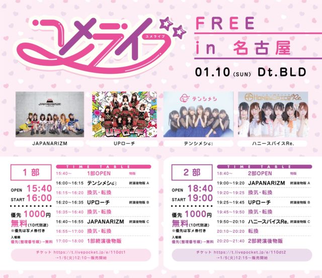 「ユメライブFREE in名古屋」 日時:01/10(日) 1部 開場15:40 / 開演16:00 2部 開場18:40 / 開演19:00 会場:Dt.BLD 料金:優先1,000円 / 一般無料 (D別) ※優先は写メ券付 出演:JAPANARIZM / UPローチ / テンシメシ໒꒱ チケット販売 1部:https://t.livepocket.jp/e/110dt1 01/05(火) 12:10 〜販売開始 2部:https://t.livepocket.jp/e/110dt2 01/05(火) 12:15 〜販売開始