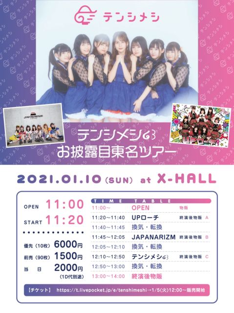 「テンシメシ໒꒱お披露目東名ツアー」 日時:01/10(日) 開場11:00 / 開演11:20 会場:X-HALL 料金:優先6,000円 / 一般1,500円 / 当日2,000円 (D別) ※優先10枚限定 出演:テンシメシ໒꒱ / JAPANARIZM / UPローチ チケット販売:https://t.livepocket.jp/e/tenshimeshi ※01/05 12:00〜販売開始