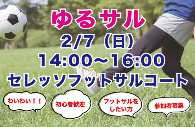 はじめまして! 初心者、未経験者を中心に土日がメインで活動しています。 年齢層は20代〜30代まで幅広く、未経験者でも経験者でも全然大歓迎です。 フットサル以外にも野球、アルティメット、BBQ、飲み会等のイベントも開催しています。 ご興味ある方はご連絡ください。 ◆ゆるサルを開催します(*´▽`*) 文化部出身でも、初心者でも、女性でも楽しめるフットサルです☆ ぜひ一緒に楽しく体を動かしましょう! ご参加お待ちしてまーす(^ -^) 【参加費】\1500 【場所】セレッソフットサルコート Aコート 【日時】2/7(日) 14