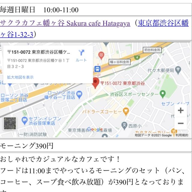 幡ヶ谷 朝カフェの会 朝カフェの会は、当日参加大歓迎、途中参加、途中退出自由のゆる〜い交流の場です。 事前申込みは不要ですので、お気軽にご参加ください。 参加費は、各自当日の飲食代のみです。 机の上に青い旗を立てていますので目印にして下さい。 2011.02.28 日曜日 10:00-11:00 開催場所 サクラカフェ幡ヶ谷 Sakura cafe Hatagaya(東京都渋谷区幡ヶ谷1-32-3) 参加費目安 モーニング390円 会場の特徴 おしゃれでカジュアルなカフェです! フードは11:00までやっているモーニングのセット(パン、コーヒー、スープ食べ飲み放