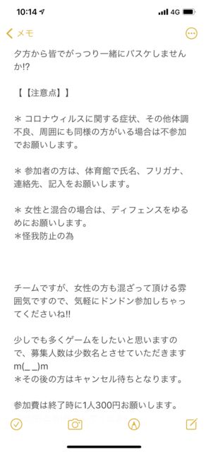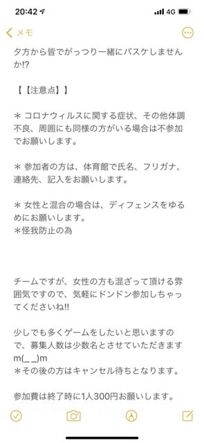参加費 200円か300円 持ち物 マスク、ゲーム用濃淡Tシャツ等、バスパン、シューズ、飲み物、ボール(あれば)、着替え・・・ 追加参加条件及び変更等 氏名・住所・連絡先の参加者名簿保管します。