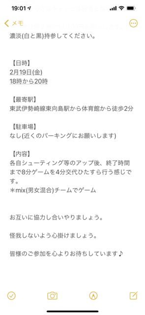こんにちはナギと申します 次の木曜日(祝日)に体育館が確保できたため、募集いたします。 基本的に皆で楽しむことを目的としておりますので女性や初心者のかたも歓迎いたします。 経験者の方ももちろん募集いたします。 『詳細』 ・場所 大田区区民プラザ地下一階 (下丸子駅から徒歩一分) ・時間 9時から11時30分です。 ・費用 500円です 9時から9時半まで各自アップ 9時半から10時まで全体アップ 10時から終了時間まで試合となっております。 『注意事項』 ・12時には完全撤収でお願いします ・体育館内は飲食禁