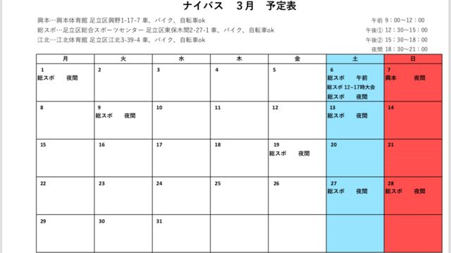 お世話になっております。 ナイバスのまさきです。 2月1日(月) 18:30〜21:00 場所 足立区総合スポーツセンター 住所 東京都足立区東保木間2丁目27−1 HP https://www.city.adachi.tokyo.jp/sports/shisetsu/koen/038.html 車10台以上、自転車、バイクok 募集人数10名程度 参加費500円 レベルは中級程度。 ゲームをしますので 白と白以外の服を持参お願いします。 審判とタイマーの協力お願いします。 分からないことがあればなんでも質問して下さい(^^) ナイバスのLINEグループあります! 先にLINEで募集し