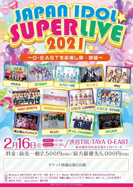 ¡ÖJAPAN IDOL SUPER LIVE 2021 O-EAST¤ò±þ±ç¤·Â⡦³ÊÔ¡× Æü»þ¡§02/16(²Ð) ³«¾ì12:30 / ³«±é13:00 ²ñ¾ì¡§½ÂëTSUTAYA O-EAST ÎÁ¶â¡§Á°ÊýºÇÍ¥Àè5,000±ß / ͽÌó2,500±ß¡ÊDÊÌ¡Ë ¥Á¥±¥Ã¥È¡§https://eplus.jp/jisl-2021/ ½Ð±é¡§chuLa/¥µ¥¯¥µ¥¯JUMBLE/STAiNY/¥á¥¤¥Ó¡¼ME/³ú¥à³ú¥à¥Ð¥ó¥Ñ¥¤¥¢/HIGH SPIRITS/¥Þ¥Ë¥Þ¥Ë/Åí¿§³×Ì¿/¥³¥¹¥á¥Æ¥£¥Ã¥¯¥í¥Ü¥Ã¥È/¥¢¥ë¥Æ¥ß¥¹¤ÎÍã/BANZAIJAPAN/¥Ë¥³¥Ë¥³ LOVERS/JAPANARIZM/elsy/¥Ë¥³¥Ë¥³ STAGE/BLUU/¤¤Ã¤È¡¢¤³¤ì¤¬À¤³¦?/XPLACE