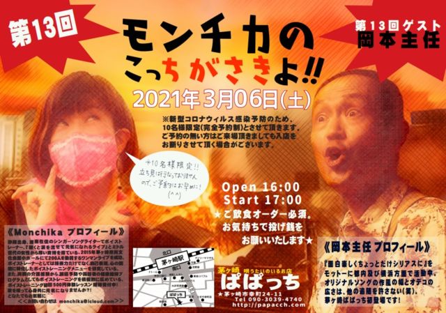 £³·î£¶Æü¡ÊÅÚ¡Ë ³ý¥öºê¡§±´¤¦¤¿¤¤¤Î¤¤¤ë¤ªÅ¹¡Ö¤Ñ¤Ñ¤Ã¤Á¡× http://papacch.com/ 16:00/17:00 ÅꤲÁ¬¡Ü°û¿© ¸ÂÄê10̾¡ÊÍ×ͽÌó¡Ë ¡ØMonchika¤Î¤³¤Ã¤Á¤¬¤µ¤¤è¡ª¡ª¡Ù ¥â¥ó¥Á¥«¤È¤Î¥Ä¡¼¥Þ¥ó¥é¥¤¥Ö¢ö