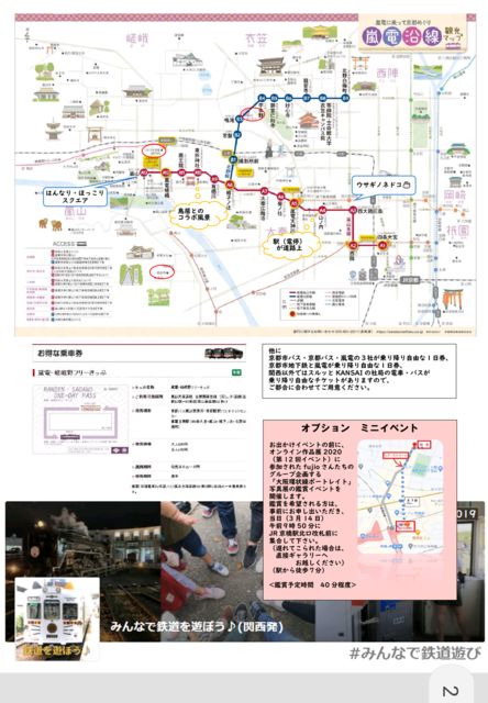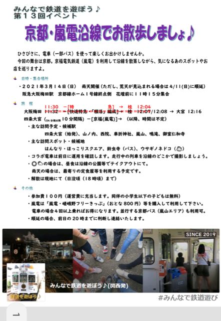 長らくお待たせしました。 社会情勢により、暫しお出かけイベントの開催を見合わせておりましたが、ようやく開催の目途がつきましたので、引き続き感染症に対する予防を行いながら、楽しくお出かけしましょう♪ 今回は、京都の嵐電こと京福電気鉄道嵐山線・北野線の沿線を楽しく散策します。 電車に乗ったり、撮影したり、今話題のあのアニメのコラボレーションを楽しんだり、 春のうららかな陽気を満喫しましょう。 タイムスケジュールにて案内チラシを作製しています。(画像参照) 阪急・大阪梅田駅に11時15分、嵐電・四条大宮駅集合は12
