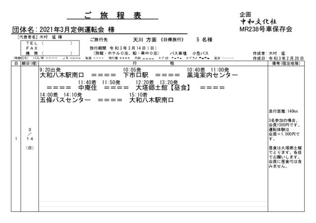 ★2021年3月7日更新★ 天川方面に行きます。 大和八木駅南口 9:20出発→15:10帰着予定 募集人員:5名 最少催行人員:3名 募集締め切り:2021年3月13日(土) 21:00(応募多数の場合は早期に募集を締め切る こともあります。ご了承ください。) ★催行確定しました。引き続き募集しておりますのでよろしくお願いいたします。 会費:3名参加の場合、お一人1,500円です。人数により変動します。運転体験希望の場合は、会費+1,000円お願いします。 ○感染症対策について (1)当会の活動に参加いただく場合、当日の体温が37.5℃以上ある