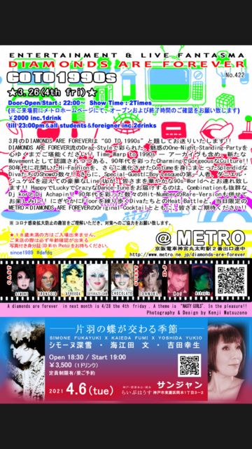 DIAMONDS ARE FOREVER presents GO TO 1990s 2021 03 26 fri @ 京都丸太町 METRO DJ kor DJ あちゃぴん シモーヌ深雪 フランソワ・アルデンテ アフリーダ・オー・ブラート そよ風さん ショコラ・ド・ショコラ ほか
