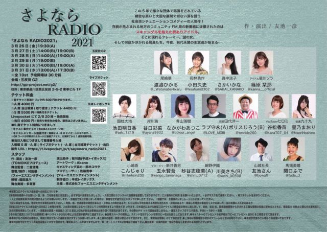 存続が危ぶまれる地方のコミュニティFM局の新番組に抜擢されたのは、スキャンダルを抱えた訳ありアイドル。そこに現れるクレーマー。謎の女。そして何故か浮かれる局員たち。今夜、前代未聞の生放送が始まる・・・ キャスト:さかいかな、他 作、演出:友池一彦 スケジュール 全10回 3/26 19:30 A 3/27 14:00 B、19:00 B 3/28 14:00 A、19:00 A 3/29 19:00 B 3/30 14:00 B、19:00 A 3/31 13:00 A、17:30 B チケット ※ドリンク代600円別途 A席4.000-、 (予約取り置き当日精算4.400-) S席5.500-、特典付チケット
