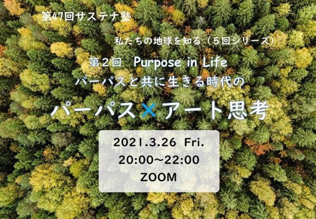 第47回サステナ塾〜私たちの地球を知る(5回シリーズ)パーパスと共に生きる時代〜パーパス×アート思考(2021年3月26日金20時〜) https://www.facebook.com/events/156307866328395 チケット:https://peatix.com/event/1842353/view 「あなたの人生の目的はなんですか」。そう問われてすぐに答えられる人は少ないのではないかと思います。 『文化的進化論』著したロナルド・イングルハートによると、社会が成熟すると、人は生存欲求よりも、その個別の意味=文化的欲求を求めるようになる。金銭的報酬よりも自分のやりがいを感じられる仕事