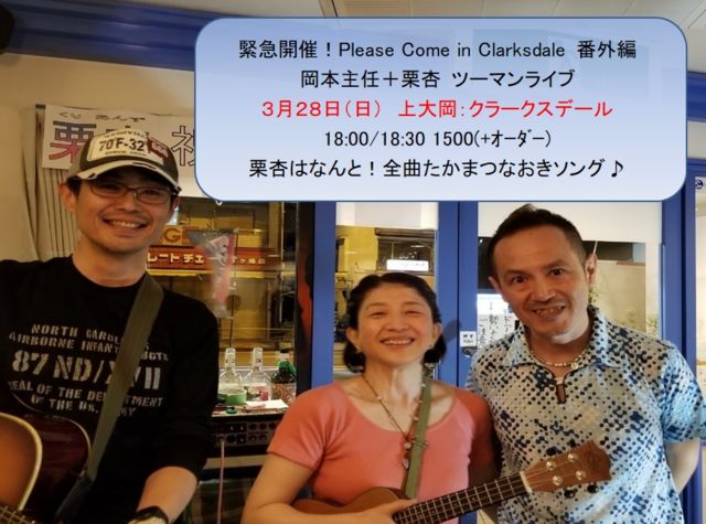 ●概要 3月28日(日) 上大岡:クラークスデール https://clarksdale.jp/ 緊急開催!Please Come in Clarksdale 特別編 18:00/18:30 1,500円(+オーダー) ●内容 たかまつなおきの代打→栗杏 なんと!栗杏は全曲(4曲)たかまつなおきソング! ラストには私も!? ●タイムスケジュール 18:30 挨拶 18:35 栗杏 19:10 休憩 19:20 岡本主任 20:05 アンコールセッション 20:15 終演 21:00 撤収