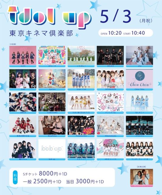 「idol up」 日時:05/03(月祝) 開場10:00 / 開演10:20 会場:東京キネマ倶楽部 料金:Sチケット8,000円 / 一般2,500円 / 当日3,000円 (D別) チケット:https://t.livepocket.jp/e/0503_idolup →4月27日(火)22:30〜販売開始 出演: iLiFE! , UPローチ , いちぜん! , XPLACE , elsy , 【eN】 , #gaisen , Gran☆Ciel , JAPANARIZM , Chöu Chöu. , SW!CH , SOMOSOMO , たまご姫【たまプリ】 , テンシメシ໒꒱ , なんキニ! , 虹色の飛行少女 , NinaPelea , Parasite.Kiss , HikuteAmata , プラスワン , 僕のclove , bob