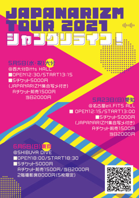 「JAPANARIZM TOUR 2021 シャングリライフ!」 日時:05/05(水祝) 開場12:30 / 開演13:15 会場: T.O.P.s BittsHALL 料金:Sチケット5,000円(集合写メ付) / Aチケット1,500円 / 当日2,000円 (D別) チケット:https://t.livepocket.jp/e/japa_oita ※4/27(火)19:00〜販売開始