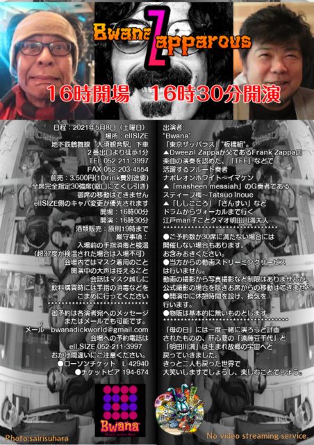 あの"Bwana" が贈る2021年古巣名古屋にて東京ザッパラスメンバーを迎えてのイベント 題して「豆とアケ。母の日を前にして」 **************************************** 非常に残念なお知らせ。 東京に発出されたクソ「非常事態宣言」のおかげで、故明田川満(アケ)夫人である 東京ザッパラス板橋組「タマオ女史」の就労シフトが変わってしまったため歌姫タマオが 参加できなくなりました。 イベント主催者として謹んでお詫び申し上げます。 **************************************** 決定事項をお知らせいたします。 ●場所:ellSIZE ●愛