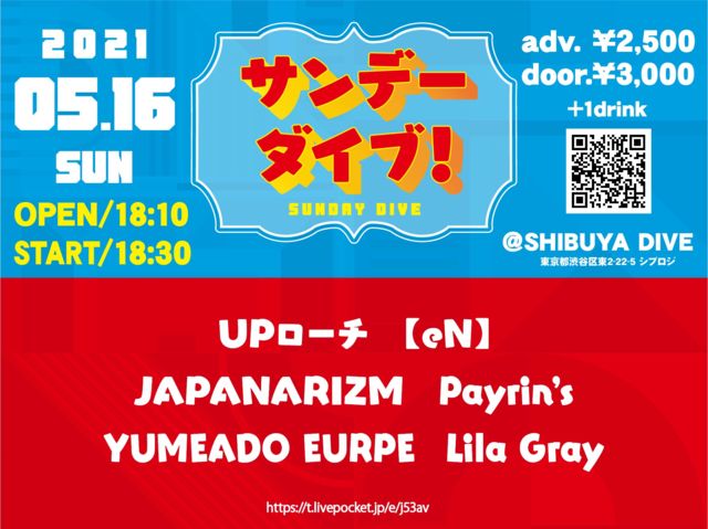 ¡Ö¥µ¥ó¥Ç¡¼¡¦¥À¥¤¥Ö¡ª¡× ¡Ö¥µ¥ó¥Ç¡¼¡¦¥À¥¤¥Ö¡ª¡× ¢£Æü»þ 2021ǯ5·î16Æü (Æü) ¢£²ñ¾ì SHIBUYA DIVE ¢£»þ´Ö OPEN18:10/START18:30 ¢£ÎÁ¶â Á°Çä¤ê2500±ß/ÅöÆü3000±ß¡¡ ¢£¥Á¥±¥Ã¥È¡¡https://t.livepocket.jp/e/j53av Æþ¾ìÆÃŵ:¥é¥ó¥À¥à¼Ì¥á·ô ¡ÚeN¡Û , UP¥í¡¼¥Á , JAPANARIZM , Lila Gray , Payrin¡Çs , YUMEADO EUROPE