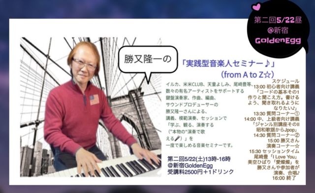 初期に米米CLUBさんでキーボーディストとして活躍していたジュリアーノ勝又隆一さんの音楽セミナーのご案内です♪ 【第二回開催致します】 勝又隆一の「実践型音楽人セミナー」第ニ回は、5/22(土)13時〜16時@新宿GoldenEggです。 (新宿歌舞伎町ドンキホーテ裏辺り) こんな状況下ではありますが、昼の時間帯、ノンアルコールで、感染予防に重々気を付けつつ執り行います イルカ、米米CLUB、天童よしみ、尾崎豊等、数々の有名アーティストをサポートする鍵盤演奏家、作曲、編曲、サウンドプロデューサーの勝又隆一さん。 武蔵