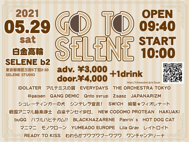 ¡ÖGoTo SELENE Vol.18¡× Æü»þ¡§05/29(ÅÚ) ³«¾ì09:40 / ³«±é10:00 ²ñ¾ì¡§Çò¶â¹âÎØSELENEb2 ÎÁ¶â¡§Á°Çä3,000±ß/ÅöÆü4,000±ß (DÊÌ) ¥Á¥±¥Ã¥È¡§https://t.livepocket.jp/e/2q-pe Æþ¾ìÆÃŵ¡§¥é¥ó¥À¥à¼Ì¥á·ô ½Ð±é¡§ THE ORCHESTRA TOKYO , ¥¢¥ë¥Æ¥ß¥¹¤ÎÍã , GANG DEMIC , ÅÀÀ÷¥Æ¥ó¥»¥¤¾¯½÷¡£ , YUMEADO EUROPE , ¥ï¥ó¥Á¥ã¥ó¥¢¥ê¡¼¥Ê , ¤¤¤Á¤¼¤ó¡ª , IDOLATER , EVERYDAYS , #gaisen , Qnto Syrup , Zsasz , JAPANARIZM , ¥·¥å¥ì¡¼¥Ç¥£¥ó¥¬¡¼¤Î¸¤ , ¥·¥ó¥Ç¥ì¥éÀë¸À¡ª , SW!CH , åºÀ±¡ù¥Õ¥£¥ª¥ì¥Ê¡¼¥É , Àï¹ñ¥¢¥Ë¥Þ¥ë¶Ë³Ú¾ôÅÚ , NEW CODOMO PROTEAN