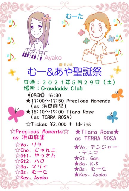 5/29 ËÜÆü¤Î¥é¥¤¥Ö¡¡ ¤à¡¼¡õ¤¢¤ä À¸Ãºץ饤¥Ö¡¡ OPEN 16:30 START 17:00 CHARGE \2000¡¡ act¡¡ Precious Moments (as ÉÍÅÄËãΤ)¡¡ Tiara Rose (as TERRA ROSA) ͽÌóÀ©¤È¤Ê¤ê¤Þ¤¹¤¬¡¢¥¨¥¤¥È¥Ó¡¼¥È¤µ¤ó¤Ë¤è¤ë¥Ä¥¤¥¥ã¥¹¥×¥ì¥ß¥¢ÇÛ¿®¤â¤´¤¶¤¤¤Þ¤¹¡£ ¥Á¥±¥Ã¥È¤Ï¤³¤Á¤é¤Ç¤¹¡£ https://twitcasting.tv/c:muaya21/shopcart/75784¡¡ ¤è¤í¤·¤¯¤ª´ê¤¤¤¤¤¿¤·¤Þ¤¹¡ª