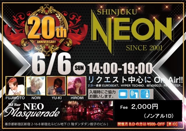 ¢£¿·½É£Î£Å£Ï£Î¡¡¡Á20¼þǯµÇ°¡Á ¡ÚÆü»þ¡Û6/6(Æü) 14:00¡Á19:00 ¡Ú¥Ï¥³¡Û¿·½É¥Í¥ª¥Þ¥¹¥«¥ì¡¼¥É ¡ÚÎÁ¶â¡Û¡é¡ê¤È¤â 2,000(¥Î¥ó¥¢¥ë¥³¡¼¥ë1D) ¡¡¡¡¡¡¢¨6·îÃÂÀ¸Æü¤ÎÊý¤Ï¼Ì¿¿ÉգɣĻý»²¤Ç 500-OFF ¡ÚÁª¶Ê¡Û¿·µìŽÕްŽÛŽËŽÞްŽÄ,ŽÊ޲ŽÊŽßްŽÃޏŽÉ¡¢80'sDISCO 2001ǯÂè3¼¡¥Ñ¥é¥Ñ¥é¥Ö¡¼¥àÃæ¤Î6·î¤ËNEON¤Ï»ºÀ¼¤ò¤¢¤²¡¢º£²ó20¼þǯ¤ò·Þ¤¨¤Þ¤¹¡£ ´¹µ¤¤ä¾ÃÆÇ¡¢Æþ¾ìÀ©¸Â¤ò¤Ï¤¸¤á´¶À÷³ÈÂçËɻߺö¤òºÇÂç¸Â¹Ö¤¸¤Æ³«ºÅ¤¤¤¿¤·¤Þ¤¹¡£ ¡Ú¤ªµÒÍͤؤª´ê¤¤¡Û ¡ü¥Þ¥¹¥¯ÃåÍÑ¡¡ ¡ü¸¡²¹(37.5Åٰʾå¤Î¾ì¹çÆþ¾ì¤ò¤ªÃǤꤤ¤¿¤·¤Þ¤¹) ¡ü¼ê»Ø¤Î¥¢¥ë¥³¡¼¥ë¾ÃÆÇ ¢£±Ä¶ÈÃæ¤Ï