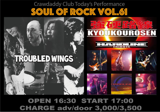 6/6 ËÜÆü¤Î¥é¥¤¥Ö¡¡ SOUL OF ROCK Vol.61¡¡ OPEN 16:30 START 17:00 CHARGE adv/door 3,000/3,500¡¡ act¡¡ TROUBLED WINGS¡¡ ¶¯¹ÅÏ©Àþ¡¡ ͽÌóÀ©¤È¤Ê¤Ã¤Æ¤ª¤¤¤ê¤Þ¤¹¡£ ¤è¤í¤·¤¯¤ª´ê¤¤¤¤¤¿¤·¤Þ¤¹¡ª¡ª