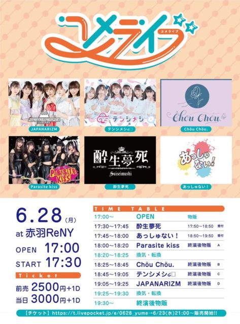 ¡Ö¥æ¥á¥é¥¤¥Ö¡× ¢£²ñ¾ì ÀÖ±©ReNY ¢£»þ´Ö OPEN17:00/START17:30 ¢£ÎÁ¶â Á°Çä2500±ß/ÅöÆü3000±ß(1DÂåÊÌÅÓ) ¢£½Ð±é JAPANARIZM/¥Æ¥ó¥·¥á¥·໒꒱/Chöu Chöu./Parasite kiss/¿ìÀ¸Ì´»à/¤¢¤Ã¤·¤å¤Ê¤¤¡ª ¢£¥Á¥±¥Ã¥È https://t.livepocket.jp/e/0628_yume ¢ª6/23(¿å)21:00¡ÁÈÎÇ䳫»Ï!!