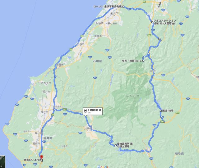 夏の日帰りロングツー (南条から南条367Km) 当日参加歓迎ですよ〜!! 集合 南条PA 8:30分には出発です(時間になったら出発) ガソリンがここで残り100K切ってる方は給油 南条PA.....140Km....金沢森本IC 第二集合 9:40分頃 金沢森本IC出てすぐのローソン金沢不動寺町(参加表明のある方はここで待ちます) https://www.e-map.ne.jp/smt/lawson/map/054013/? 次の給油ポイントはR304金沢です。 帰りは大野か滋賀向きの南条PAが最後の給油ポイントです。 道順は地図の通り 北陸道を金沢森本IC...R304...五箇山...R156.