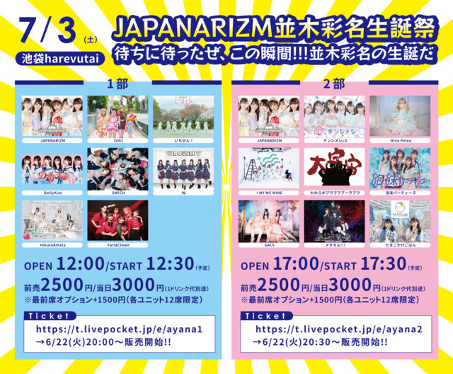 ¡ÖJAPANARIZMÊÂÌÚºÌ̾À¸Ãºס¡ÂÔ¤Á¤ËÂԤ俤¼¡¢¤³¤Î½Ö´Ö!!!ÊÂÌÚºÌ̾¤ÎÀ¸Ã¤À¡× ÆüÄø¡§07/03(ÅÚ) ²ñ¾ì¡§ÃÓÂÞharevutai ÎÁ¶â¡§Á°Çä2,500±ß / ÅöÆü3,000±ß (DÊÌ) ¢¨ºÇÁ°ÀÊ¥ª¥×¥·¥ç¥ó+1,500±ß(³Æ¥æ¥Ë¥Ã¥È12ÀʸÂÄê) £±Éô¡§³«¾ì12:00 / ³«±é12:30 ¥Á¥±¥Ã¥È¡§https://t.livepocket.jp/e/ayana1 ½Ð±é¡§JAPANARIZM/¡ÚeN¡Û/¤¤¤Á¤¼¤ó¡ª/DollyKiss/SW!CH/W./HikuteAmata/Fariaclown £²Éô¡§³«¾ì17:00 / ³«±é17:30 ¥Á¥±¥Ã¥È¡§https://t.livepocket.jp/e/ayana2 ½Ð±é¡§JAPANARIZM/¥Æ¥ó¥·¥á¥·໒3/NinaPelea/I MY ME MINE/¤ï¤ì¤é¤¬¥×¥ï¥×¥ï¥×¡¼¥ï¥×¥ï